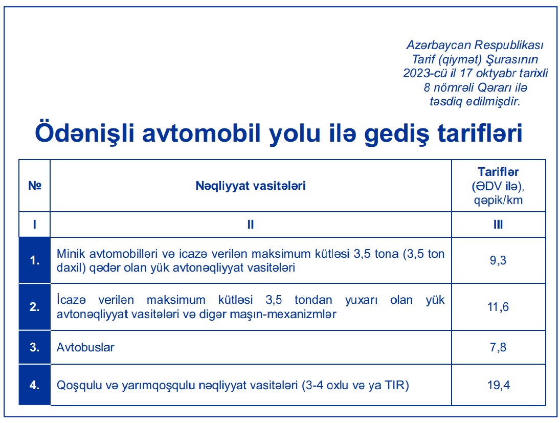Qeyd edək ki, ödənişli yoldan istifadə edən sürücülər daxil olduğu ödəniş məntəqələrindən başlayaraq yalnız qət edəcəyi məsafəyə (km) uyğun ödəniş etməlidirlər.
