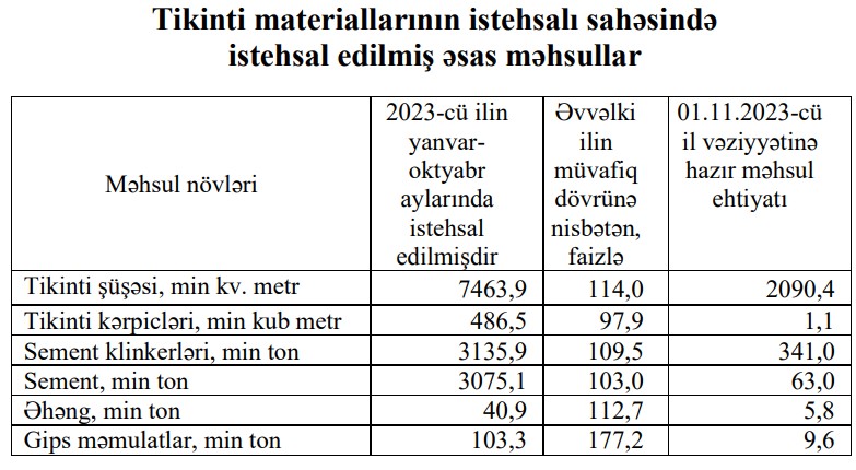 Tikinti materiallarının istehsalı sahəsində 2023-сü ilin yanvar-oktyabr aylarında istehsalın ümumi dəyəri 933,6 milyon manat olmaqla, əvvəlki ilin müvafiq dövrü ilə müqayisədə 29,7 faiz artmışdır. Dövr ərzində tikinti gipsinin istehsalı 2 dəfə, gips məmulatlarının istehsalı 77,2 faiz, beton istehsalı 15,4 faiz, tikinti şüşəsinin istehsalı 14 faiz, əhəng istehsalı isə 12,7 faiz artmışdır.