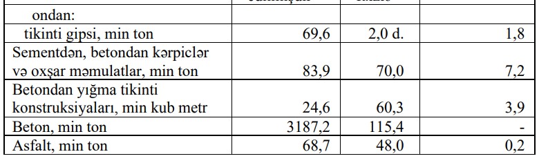 Dövr ərzində tikinti gipsinin istehsalı 2,0 dəfə, gips məmulatlarının istehsalı 77,2 faiz, beton istehsalı 15,4 faiz, tikinti şüşəsinin istehsalı 14,0 faiz, əhəng istehsalı isə 12,7 faiz artmışdır.