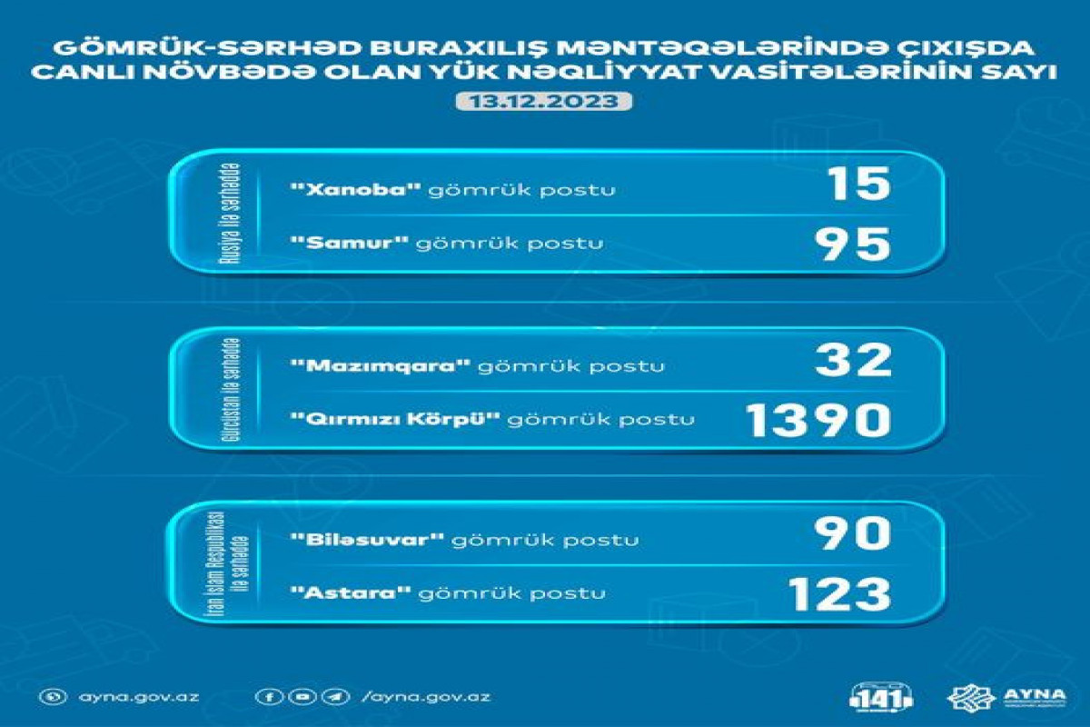 Azərbaycan Yerüstü Nəqliyyat Agentliyi (AYNA) gömrük-keçid məntəqələrində yük maşınlarının sayı ilə bağlı daşıyıcıların davamlı məlumatlandırılması xidmətinə başlayıb. Bu da onlara səfərlərini planlayarkən gömrük postundakı mövcud vəziyyətə uyğun olaraq addım atmağa imkan yaradır.