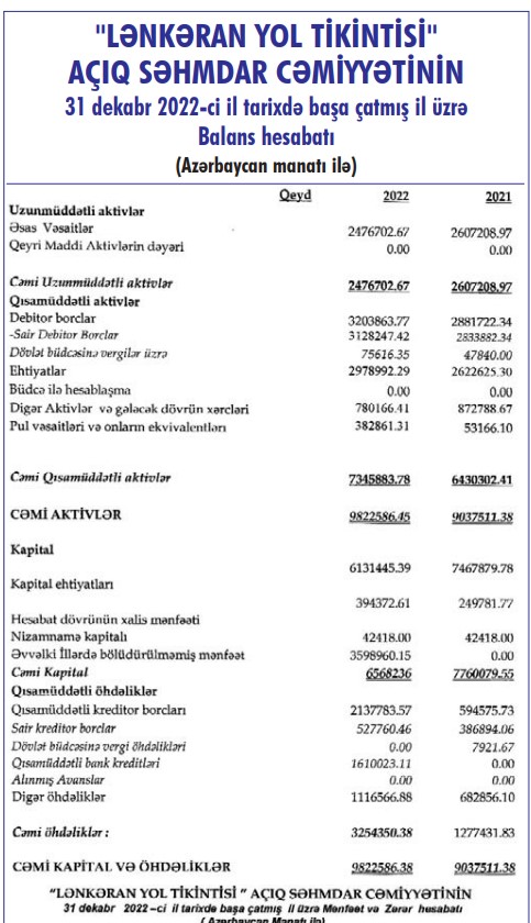 Marja.az xəbə verir ki, "Lənkəran Yol Tikintisi" ASC-nin cəmi gəlirləri 2021-ci ildə 2 milyon 674 min 814 manat ikən, 2022-ci ildə 2 milyon 800 min 613 manata yüksəlib. Şirkətin xərcləri isə 2 milyon 423 min 455 manatdan 2 milyon 656 min 22 manata qalxıb.