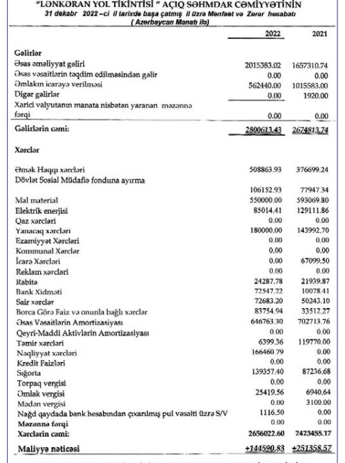 "Lənkəran Yol Tikintisi" ASC 2022-ci ili 144 min 591 manat xalis mənfəət ilə başa vurub. Şirkət 2021-ci ili 251 min 358 manat xalis mənfəət ilə bağlamışdı. Büləliklə, "Lənkəran Yol Tikintisi"nin xalis mənfəəti 2022-ci ildə 2021-ci illə müqayisədə 42,6% azalıb. Xalis mənfəətin azalması xərclərin artması ilə bağlıdır.