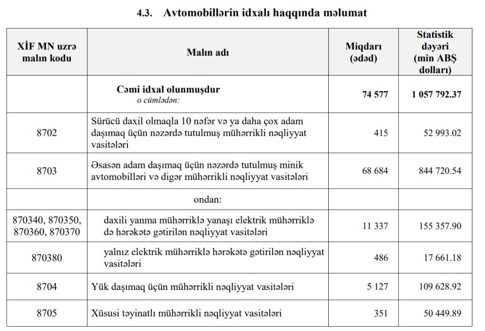 Müqayisə üçün qeyd edək ki, 2022-ci ildə Azərbaycana 1 milyard 57 milyon 792 min dollar dəyərində 74 min 577 ədəd nəqliyyat vasitəsi, o cümlədən 844 milyon 720 min dollar dəyərində 68 min 684 ədəd minik avtomobili idxal olunmuşdu.