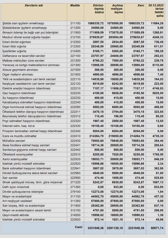 Audiovizual Şuranın 2023-cü ildə xərc maddələri üzrə maliyyələşmə və faktiki xərcləri əlavə cədvəldə təqdim olunur.