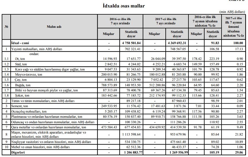 Sənaye və istehlakçılar haradan, nə alıblar? DGK-nın məlumatına görə, idxal əsasən ərzaq (idxalın 17,13%-i), maşın, mexanizm, elektrik cihazları, onların avadanlıq və ehtiyat hissələri (idxalın 21,82%-i), nəqliyyat vasitələri və ehtiyat hissələrindən (idxalın 10,89%-i) ibarətdir. Siyahıya həm də tütün və tütün məmulatı (2,01%), əczaçılıq məhsulları (2,27%), plastmas və məmulatı (3,63%), taxta-şalban (2,55%), qara metal və məmulatı (9,49%) və s 29,06% daxildir. Əsas tədarükçülər RF, Türkiyə, Çin, ABŞ və Almaniyadır.