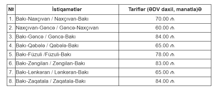 Hava nəqliyyatı ilə ölkədaxili sərnişindaşıma xidmətlərinin tariflərinin yuxarı hədləri (əks istiqamət üzrə eyni olmaqla):