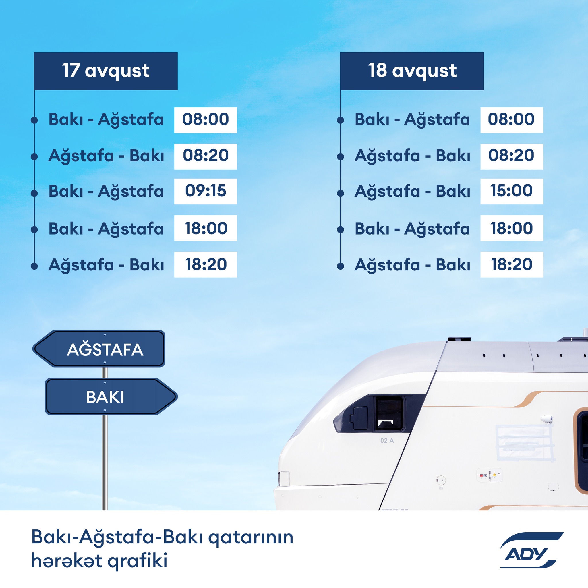(®) Azərbaycan Dəmir Yolları (ADY) Bakı-Ağstafa-Bakı marşrutu üzrə daha çox sərnişini rahat və təhlükəsiz mənzilbaşına çatdırmaq üçün 17 və 18 avqust tarixlərində əlavə reyslər təyin edir.