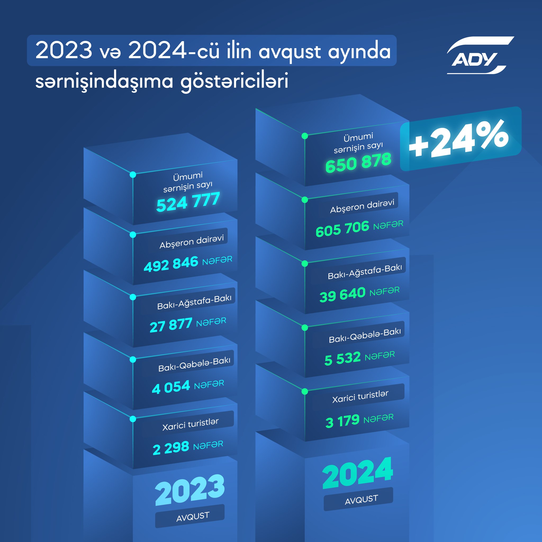 ADY-nin yaydığı məlumatda bildirilir ki, marşrutlar üzrə ən böyük artım 41%-lə Bakı-Ağstafa-Bakı marşrutunda qeydə alınıb.