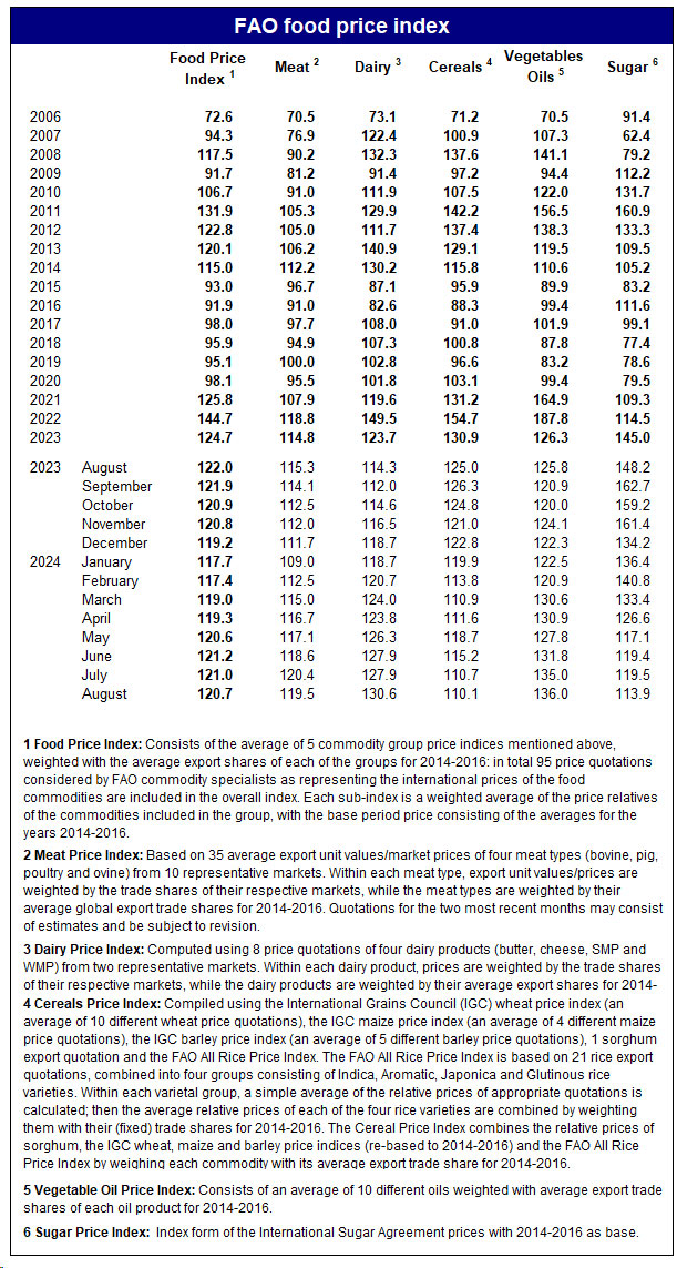 FAO ərzaq məhsullarının beynəlxalq qiymətlərində aylıq dəyişiklikləri izləyən Qlobal Ərzaq Qiymətləri İndeksinin avqust ayı nəticələrini açıqlayıb. Müvafiq olaraq, indeks avqust ayında iyul ayına nisbətən 0,3 bənd azalaraq 120,7 bənd olub. Qlobal ərzaq qiymətləri illik müqayisədə (2023-cü ilin avqust ayı ilə müqayisədə) təxminən 1,1 faiz azalıb. Avqust ayında indeksin məhdud şəkildə enməsi şəkər, ət və taxıl məhsullarına tələbatın azalmasının bitki yağı və süd məhsullarına olan tələbat artımını üstələməsi ilə bağlıdır.