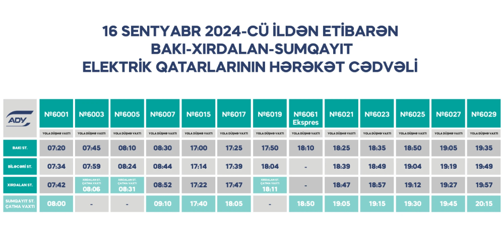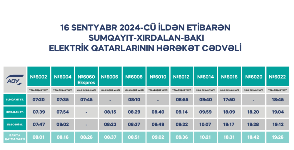 “Azərbaycan Dəmir Yolları” Qapalı Səhmdar Cəmiyyətinin (ADY) Abşeron dairəvi dəmir yolu xətti ilə hərəkət edən qatarları yeni dərs ilinin başlaması ilə əlaqədar artacaq sərnişin tələbatını təmin etmək məqsədilə 16 sentyabr 2024-cü il tarixindən etibarən yenilənmiş hərəkət cədvəli ilə xidmət göstərəcəkdir.