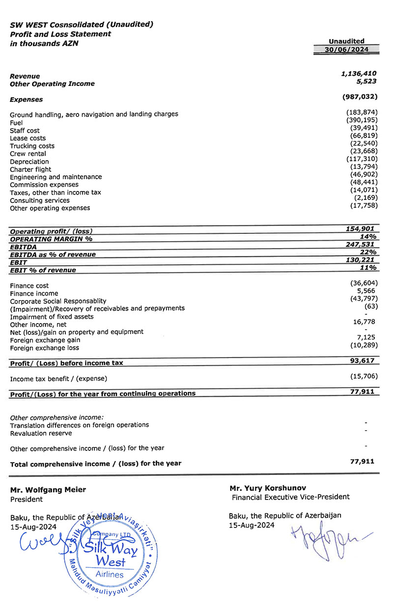 Azərbaycan hava yükdaşımaları şirkəti "Silk Vey Vest Aviaşirkəti" MMC 2024-cü ilin birinci yarısını (yanvar-iyun) 77 milyon 911 min manat xalis mənfəət ilə başa vurub. Şirkət 2023-cü ilin birinci yarısını 10 milyon 85 min manat xalis mənfəət ilə bağlamışdı. Beləliklə, "Silk Vey Vest Aviaşirkəti"nin xalis mənfəəti 7,7 dəfə artıb. Xalis mənfəətin artması gəlirin artmasından qaynaqlanır.
