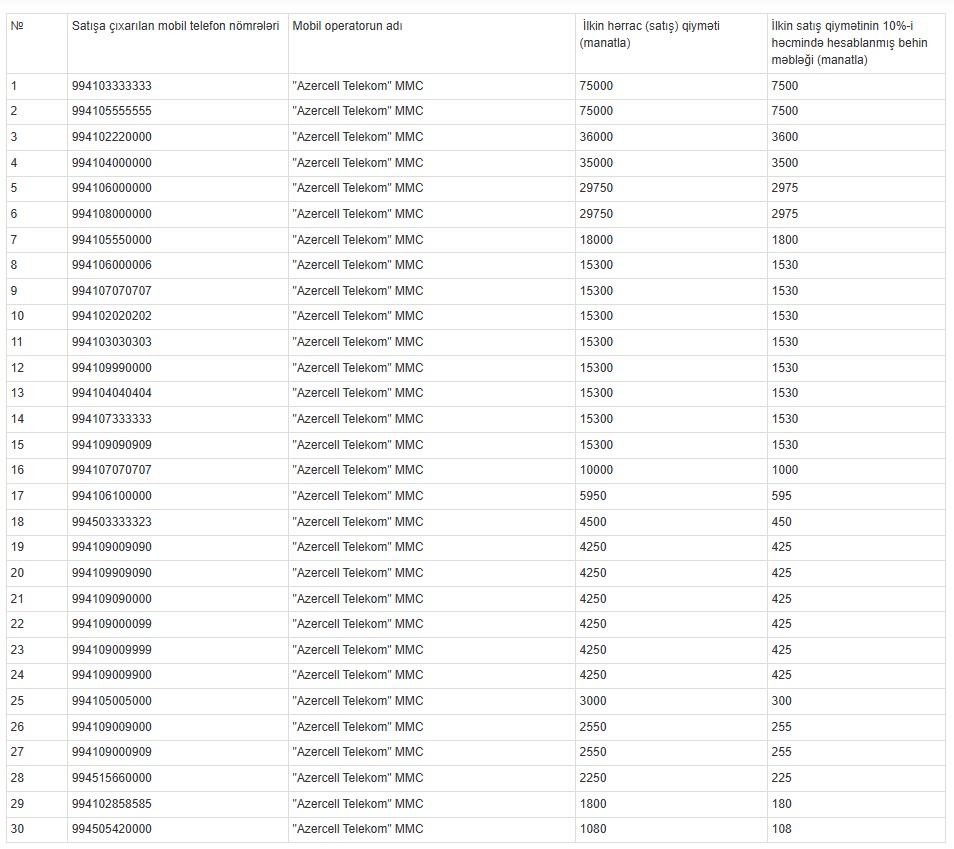 Mobil telefon nömrələri 1 000 - 75 000 manat qiymətlərə hərraca çıxarılır - SİYAHI