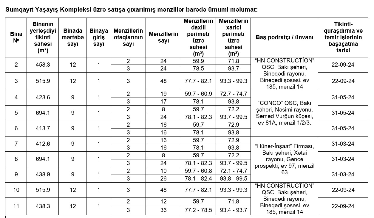 Satışa Sumqayıt Yaşayış Kompleksi üzrə 392, Lənkəran Yaşayış Kompleksi üzrə 152 mənzil olmaqla, ümumilikdə 544 mənzil çıxarılır. Bütün mənzillər tam təmirli, mətbəx mebeli, kombi isitmə sistemi (kombi cihazı daxil olmaqla), su, qaz və elektrik sayğacları ilə təmin edilmiş vəziyyətdə təklif olunur.