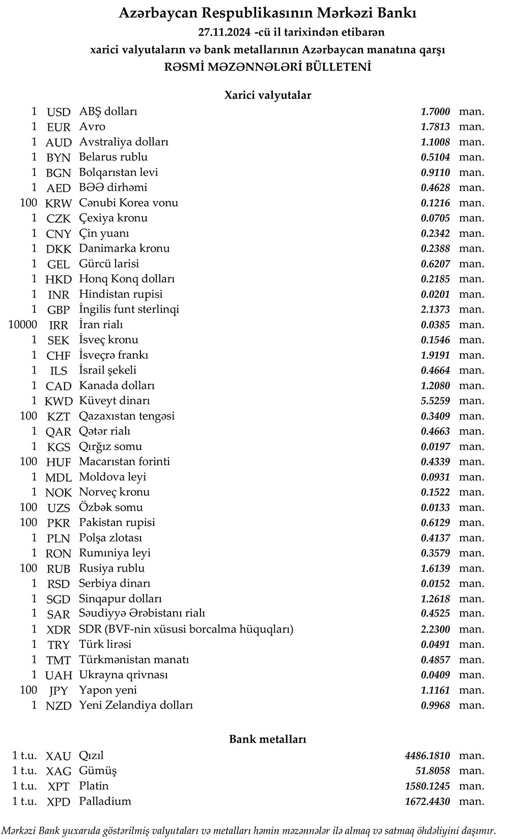 Rəsmi məzənnələr açıqlandı
