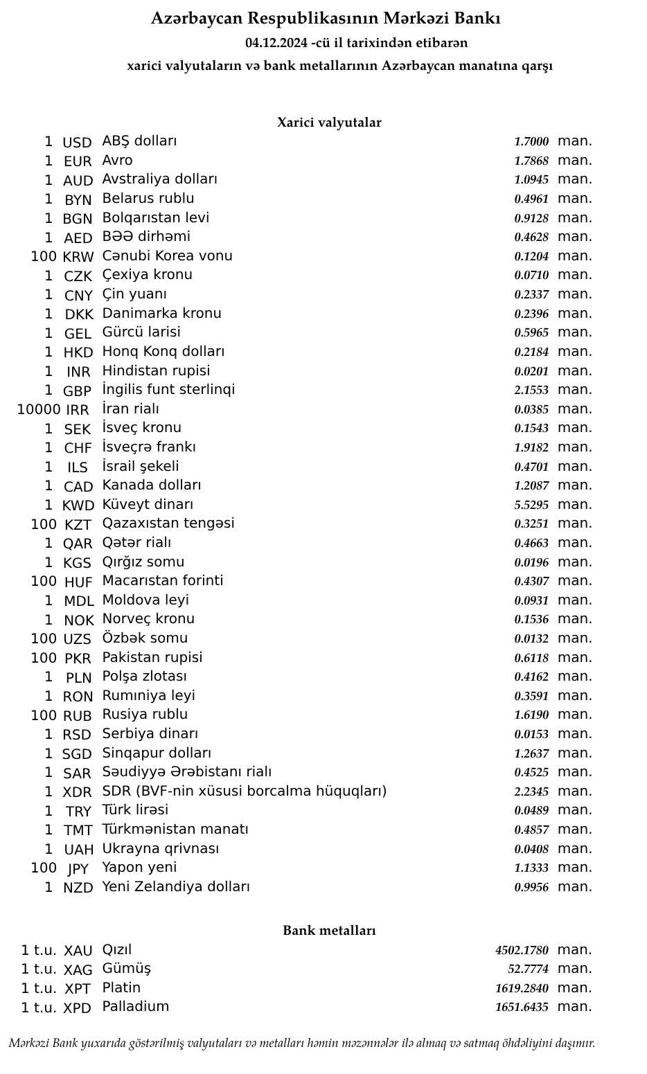 Rəsmi məzənnələr açıqlandı