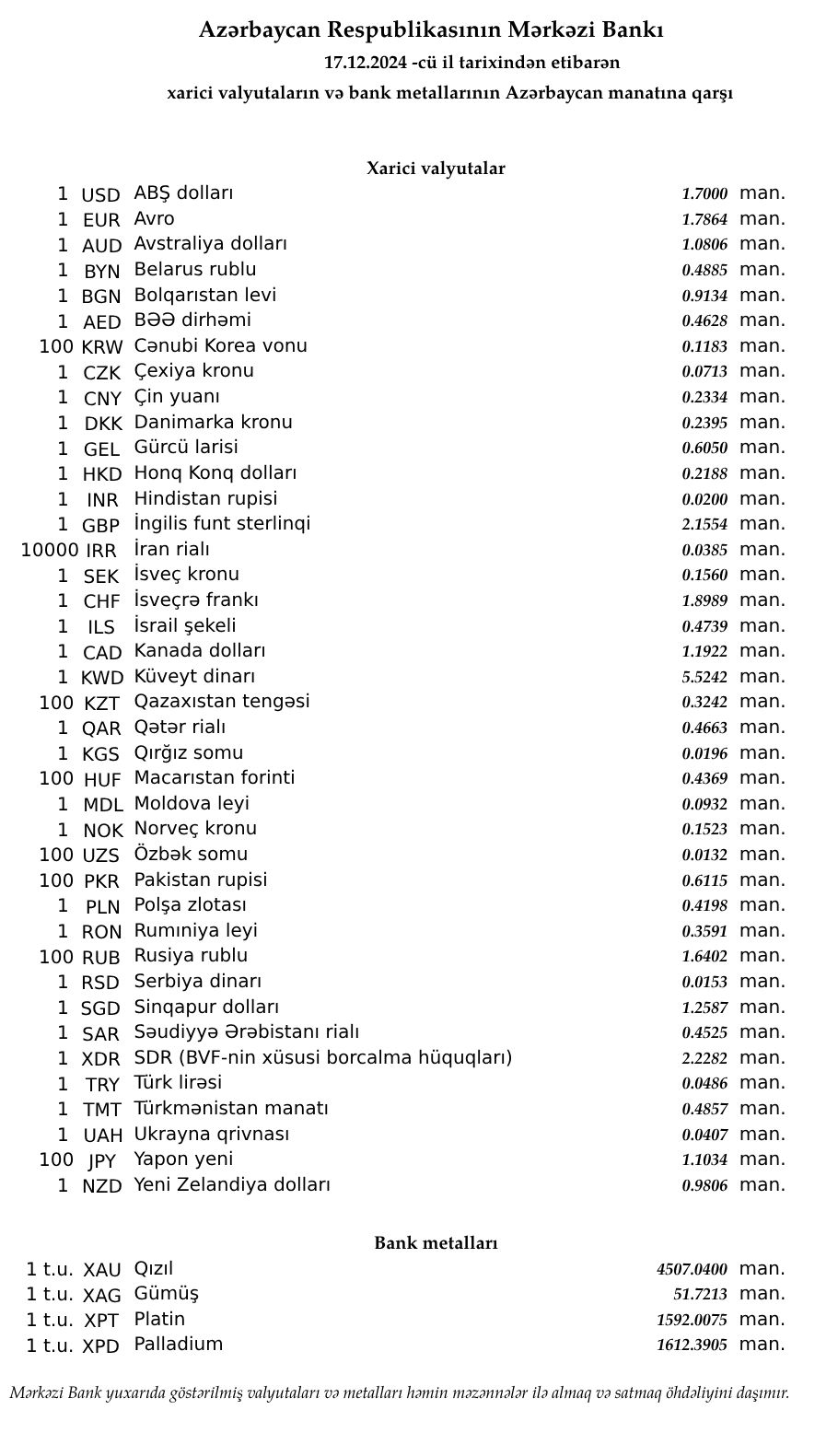 Rəsmi məzənnələr açıqlandı