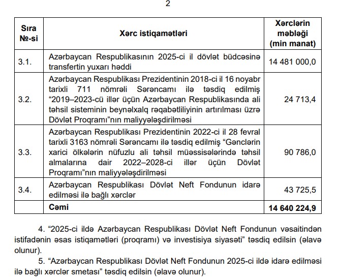 1. Azərbaycan Respublikası Dövlət Neft Fondunun (bundan sonra – Fond) vəsaitinin xərc istiqamətləri: 1.1. Azərbaycan Respublikasının 2025-ci il dövlət büdcəsinə transfertin yuxarı həddi;