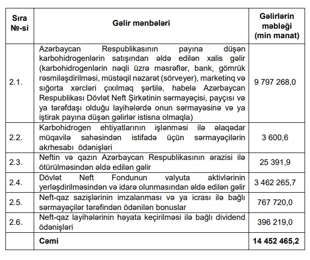 Müəyyən edilib ki, Azərbaycan Respublikası Dövlət Neft Fondunun 2025-ci il büdcəsinin gəlirləri aşağıdakı daxilolmalar hesabına formalaşır: