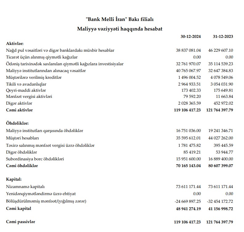 2024-cü ildə "Bank Melli İran" Bakı filialının kredit portfeli (müştərilərə verilmiş kreditlər) 2,7 dəfə azalaraq 1 milyon 496 min manata geriləyib. Maliyyə institutlarından alınacaq vəsaitlər isə 8 milyon 118 min manat və ya 25%-ə yaxın artaraq 40 milyon 765 min manata yüksəlib. Qiymətli kağızlara investisiyalar 2 milyon 352 min manat və ya 6,7% azalaraq 32 milyon 762 min manata düşüb.