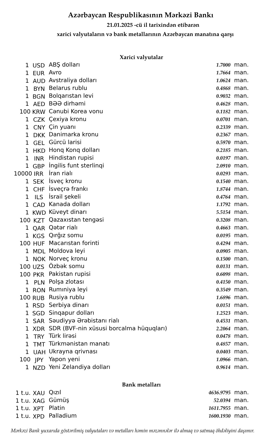 Rəsmi məzənnələr açıqlandı