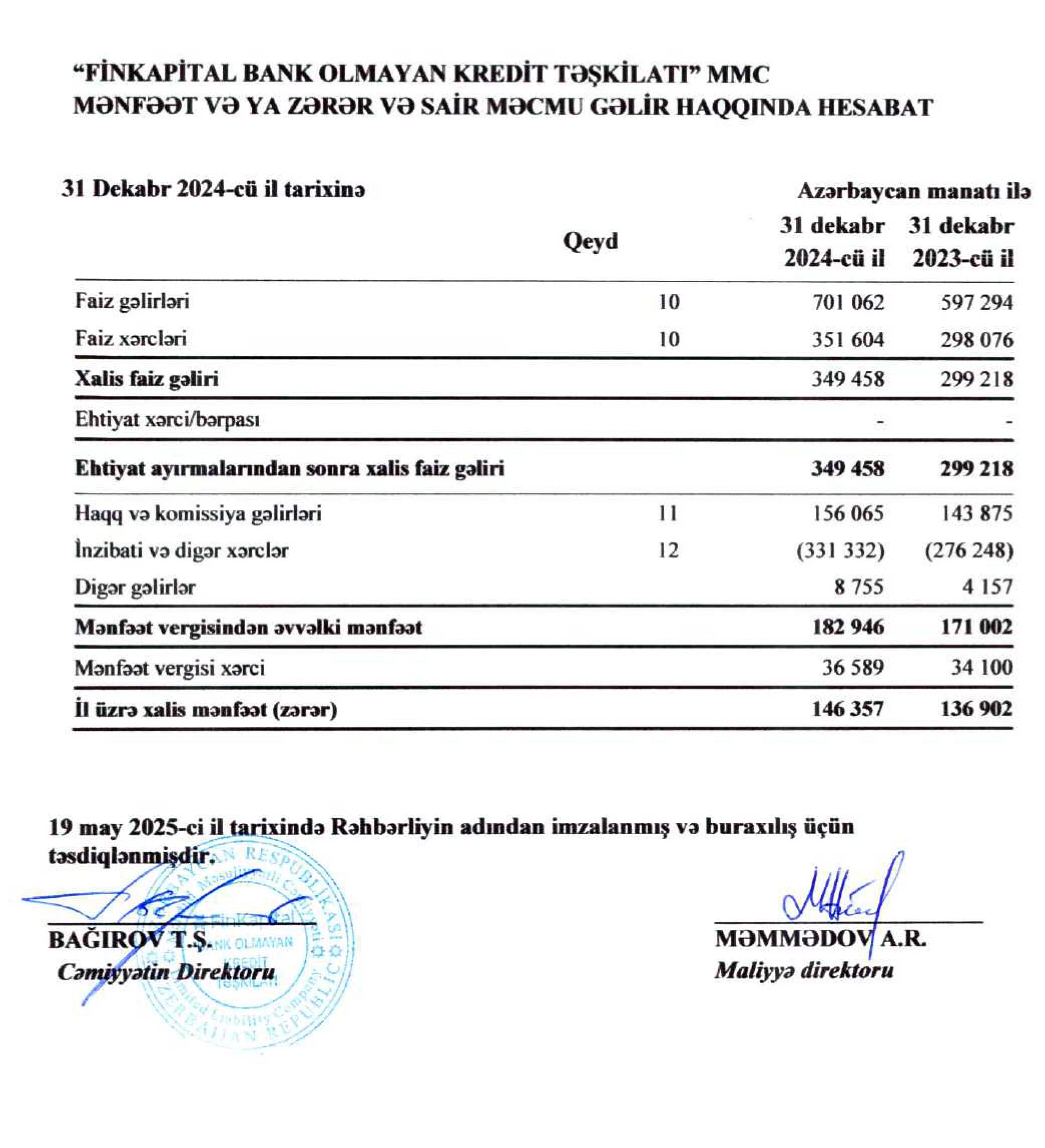 "Finkaptial BOKT"ın 2024-cü il üzrə maliyyə hesabatları – FAİZ GƏLİRLƏRİ VƏ MƏNFƏƏTİ ARTIB