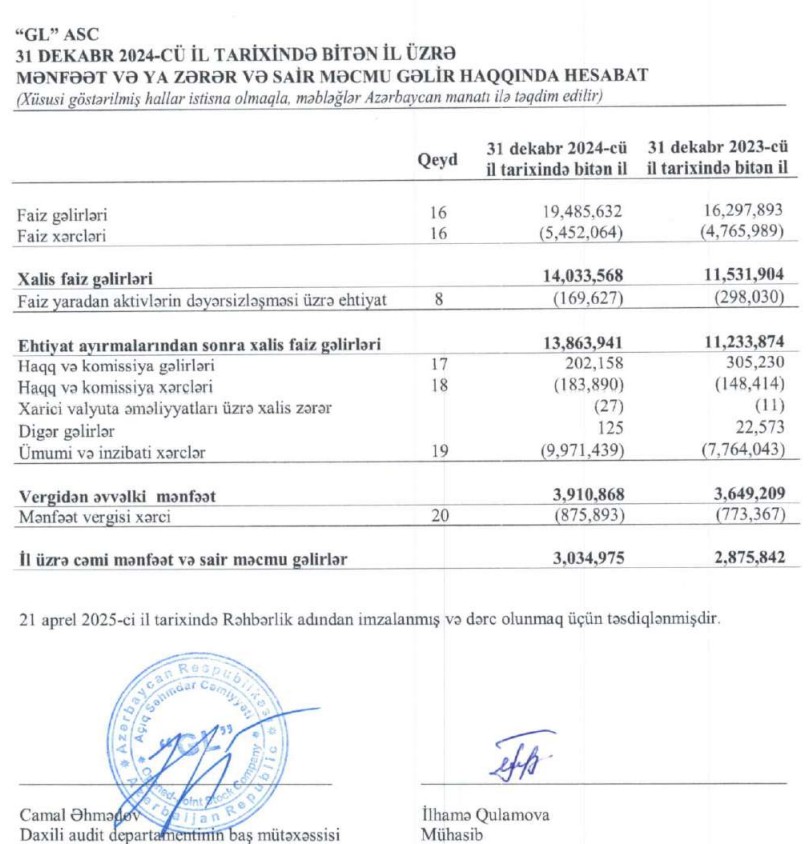 Marja.az şirkətin 2024-cü il üzrə maliyyə hesabatlarına istinadən xəbər verir ki, "GL" ASC-nin faiz gəlirləri 2023-cü ildə 16 milyon 298 min manat ikən, 2024-cü ildə 19 milyon 486 min manata yüksəlib (3 milyon 188 min manat və ya 19,6% artıb ) Şirkət ötən il 202 min manat haqq və komissiya gəlirləri əldə edib (2023-cü ildə 305 min manat).