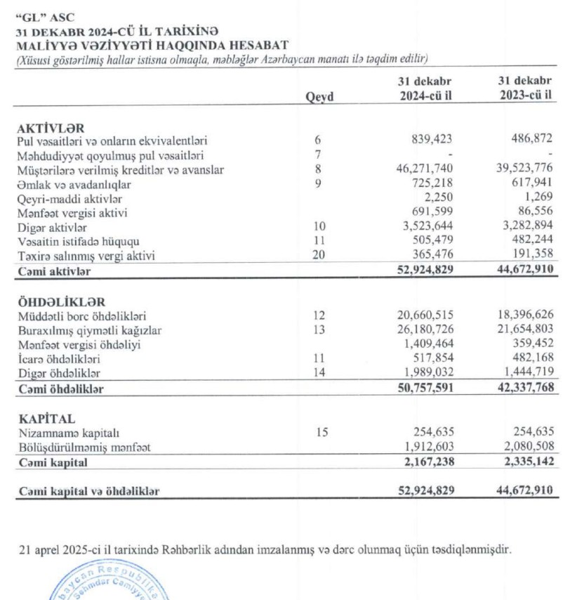 "GL" ASC 2024-cü ilin yekununda 52 milyon 924 min manat cəmi aktivlərə malik olub (2023-cü ilin sonunda 46 milyon 673 min manat).