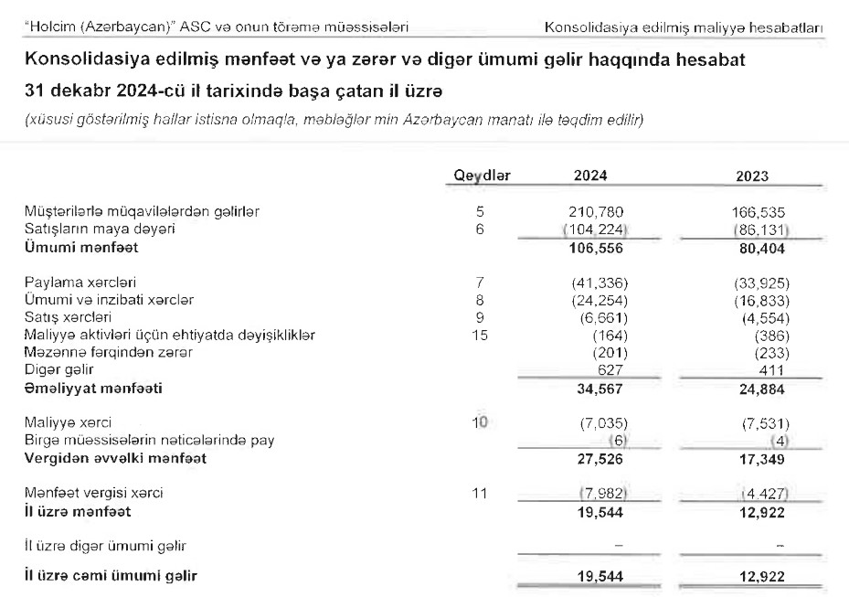Bakının Qaradağ rayonunda yerləşən zavodunda sement istehsalı ilə məşğul olan "Holcim (Azərbaycan)" ASC 2024-cü ili 19 milyon 544 min manat xalis mənfəət ilə başa vurub. Şirkət 2023-cü ili 12 milyon 922 min manat xalis mənfəət ilə bağlamışdı. Beləliklə, "Holcim Azərbaycan"ın xalis mənfəəti ötən il 2023-cü illə müqayisədə 6 milyon 622 min manat və ya 51,2% artıb.