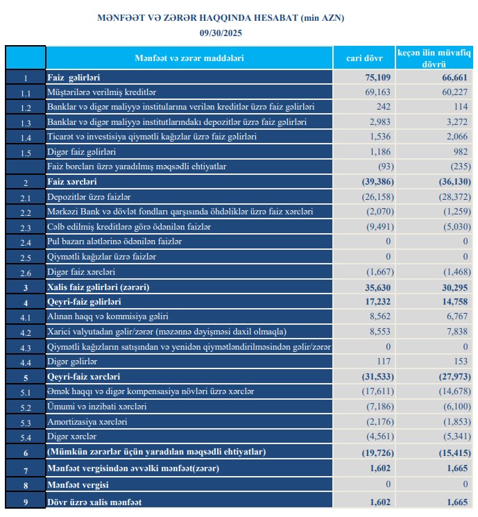 2025-ci ilin ilk doqquz ayında "TuranBank"ın xalis mənfəəti isə 1 milyon 602 min manat olub ki, bu da ötən ilin göstəricisindən 63 min manat və ya 3,8% azdır (2024 – 1 milyon 665 min manat).