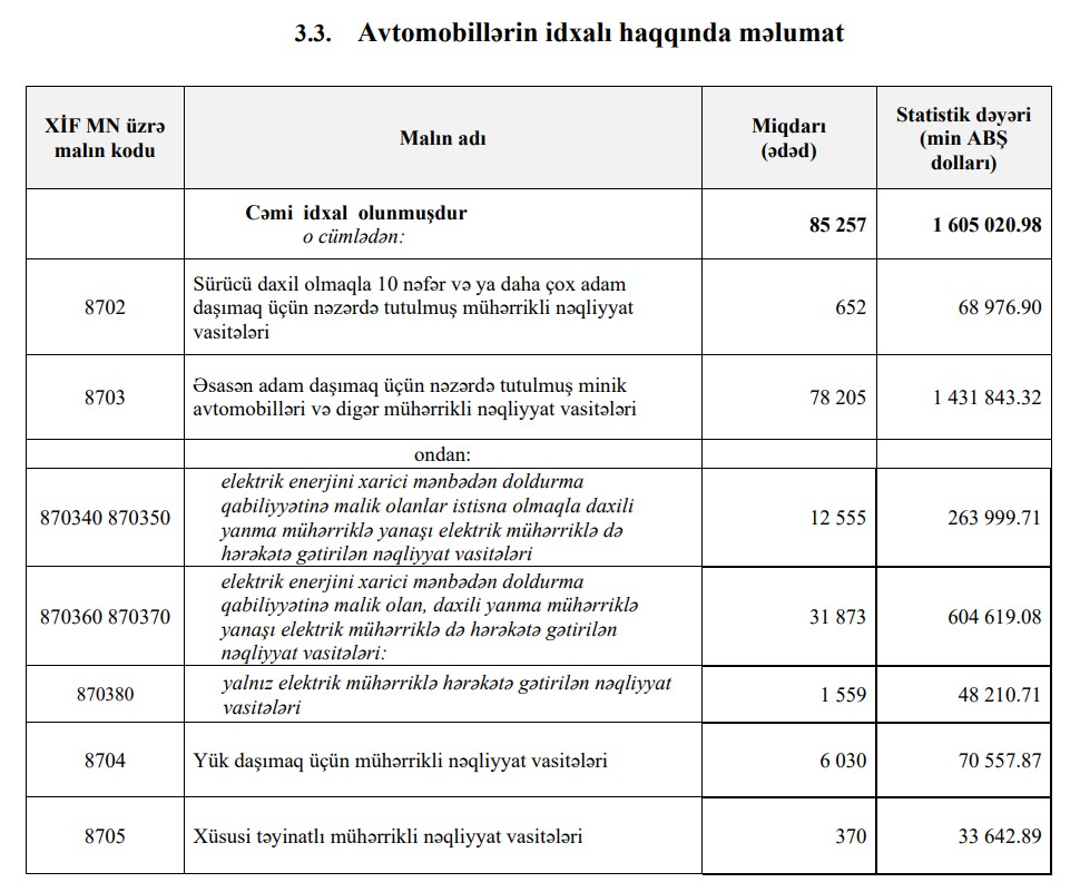 2025-ci ilin 9 ayı ərzində Azərbaycana 45 min 987 ədəd hibrid, plagin-hibrid və tam elektrik nəqliyyat vasitəsi idxal olunub. Bu idxal üçün 916 milyon 829 min dollar sərf edilib.