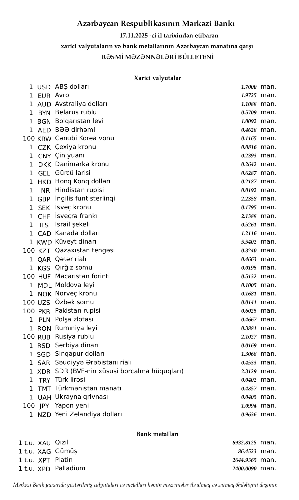 Dolların sabah üçün rəsmi məzənnəsi müəyyən edilib