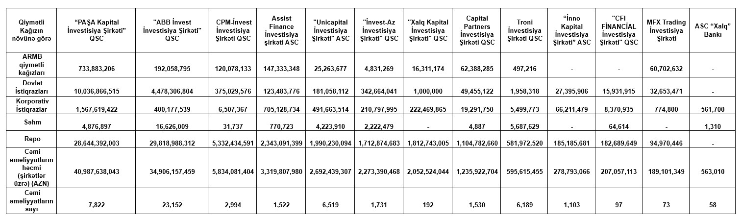Marja.az Bakı Fond Birjasına istinadən xəbər verir ki, “PAŞA Kapital İnvestisiya Şirkəti” QSC 34 milyard 906 milyon 157 min manat dövriyyə ilə 1-ci, “CPM-İnvest İnvestisiya Şirkəti” QSC 5 milyard 834 milyon 81 min manat dövriyyə ilə 2-ci, "Assist Finance İnvestisiya Şirkəti" ASC 3 milyard 319 milyon 808 min manat dövriyyə ilə 3-cü, "Unicapital İnvestisiya Şirkəti" ASC 2 milyard 692 milyon 439 min manat dövriyyə ilə 4-cü və "İnvest-AZ İnvestisiya Şirkəti" QSC 2 milyard 273 milyon 390 min manat dövriyyə ilə 5-ci yeri tutub.