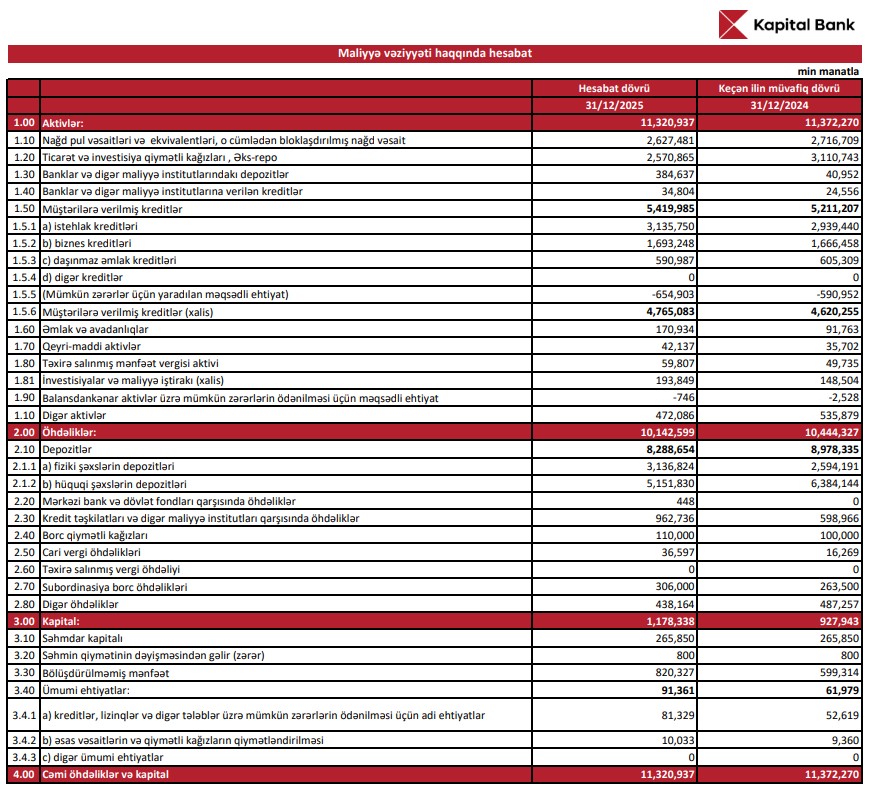 31 dekabr 2025-ci il tarixinə Kapital Bankın kredit portfelinin strukturu: