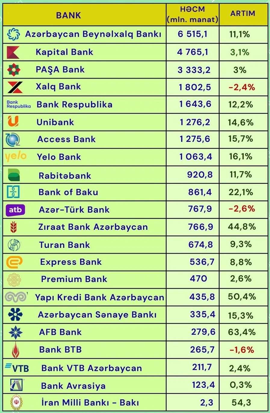 Bunlar, “Azərbaycan Beynəlxalq Bankı” (6 milyard 515,1 milyon manat), “Kapital Bank” (4 milyard 765,1 milyon manat), “PAŞA Bank” (3 milyard 333,2 milyon manat), “Xalq Bank” (1 milyard 802,5 milyon manat) və “Bank Respublika”dır (1 milyard 653,6 milyon manat).