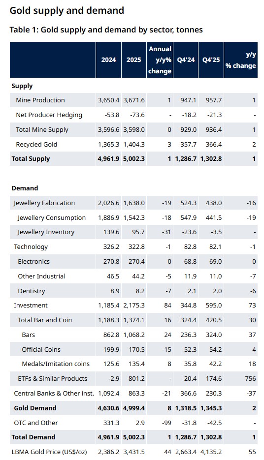 World Gold Council (WGC) tərəfindən yayımlanan “Gold Demand Trends: Q4 and Full Year 2025” hesabatına görə, qlobal qızıl tələbi 2025-ci ildə ilk dəfə 5000 ton səviyyəsini keçərək tarixi bir həddi aşıb. Hesabatda göstərilir ki, qlobal qızıl tələbi əsasən investisiya yönümlü artımın təsiri ilə rekord səviyyəyə çatıb. Qızıl ETF-ləri* və külçə-sikkə alışları ön plana çıxarkən, mərkəzi bankların alışları da yüksək səviyyəsini qoruyub.