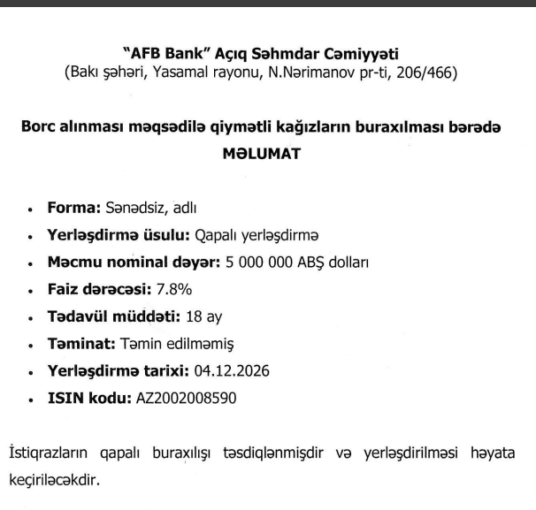 Məlumata görə, 5 000 000 ABŞ dolları məbləğində sənədsiz, adlı, təmin edilməmiş istiqrazlıar qapalı yerləşdiriləcək.