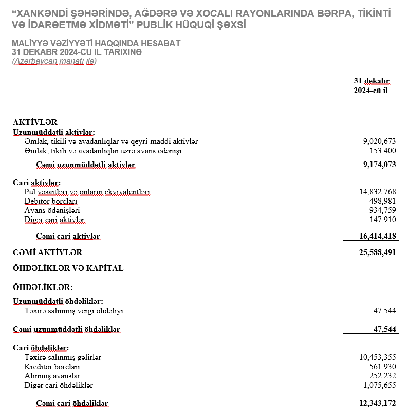 31 dekabr 2024-ccü il tarixində “Xankəndi şəhərində, Ağdərə və Xocalı rayonlarında Bərpa, Tikinti və İdarəetmə Xidməti” 25 milyon 588 min manat cəmi aktivlərə malik olub.