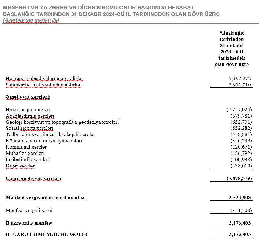 “Xankəndi şəhərində, Ağdərə və Xocalı rayonlarında Bərpa, Tikinti və İdarəetmə Xidməti” Publik Hüquqi Şəxs başlanğıc tarixindən (1 aprel 2024-cü il) 31 dekabr 2024-cü il tarixinədək olan dövr üzrə (9 ay ərzində) 3 milyon 173 min manat xalis mənfəət əldə edib.
