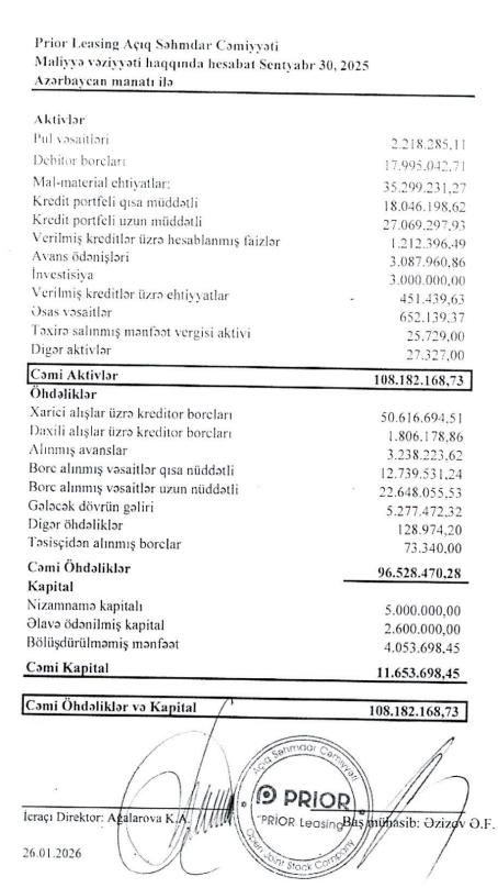 Ötən il "Prior Leasing"in cəmi aktivləri 100 milyon manatı keçərək 30 sentyabr 2025-ci il tarixində 108 milyon 182 min manata çatıb. Şirkət 2024-cü ilin eyni tarixində 90 milyon 771 min manata cəmi aktivlərə malik idi.