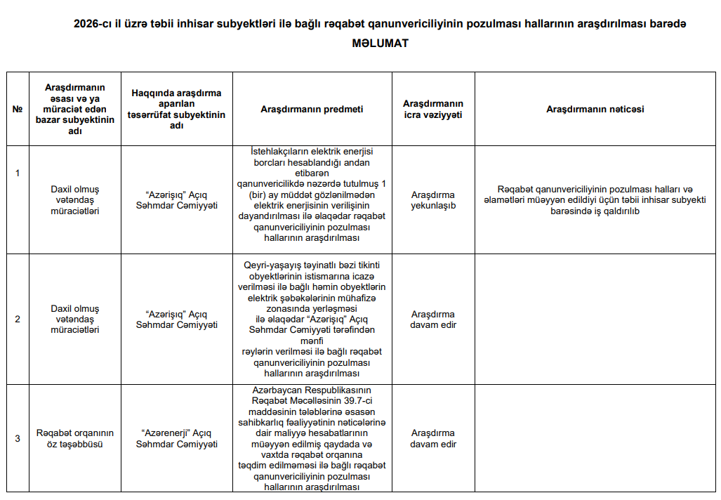 Araşdırmanın nəticələrinə əsasən, rəqabət qanunvericiliyinin pozulması halları və əlamətləri müəyyən edildiyi üçün təbii inhisar subyekti olan "Azərişıq" barəsində iş qaldırılıb.