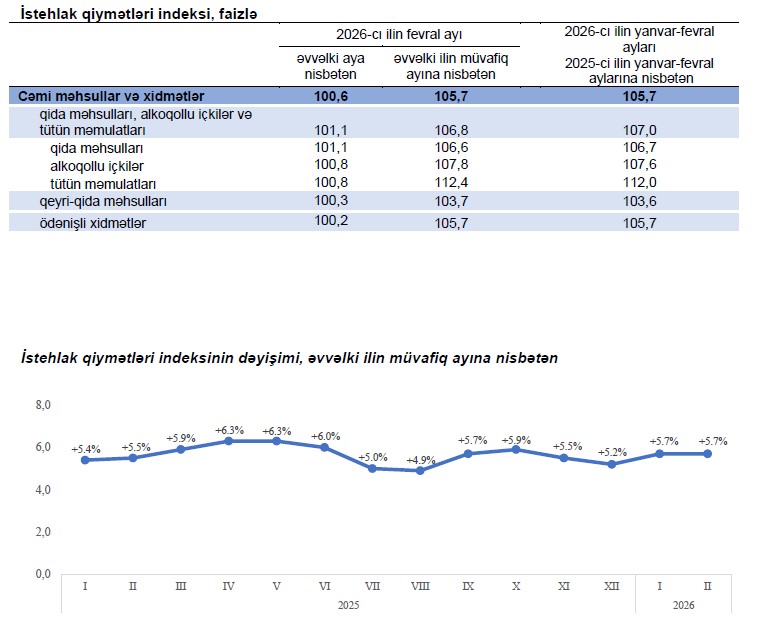 2026-cı ilin fevral ayında istehlak qiymətləri indeksi (inflyasiya göstəricisi) 2025-ci ilin fevral ayına nisbətən 5,7 faiz, o cümlədən qida məhsulları, alkoqollu içkilər və tütün məmulatları üzrə 6,8 faiz, qeyri-qida məhsulları üzrə 3,7 faiz, əhaliyə göstərilmiş ödənişli xidmətlər üzrə 5,7 faiz artmışdır.