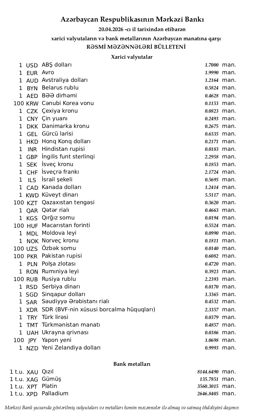 Rəsmi məzənnələr açıqlandı