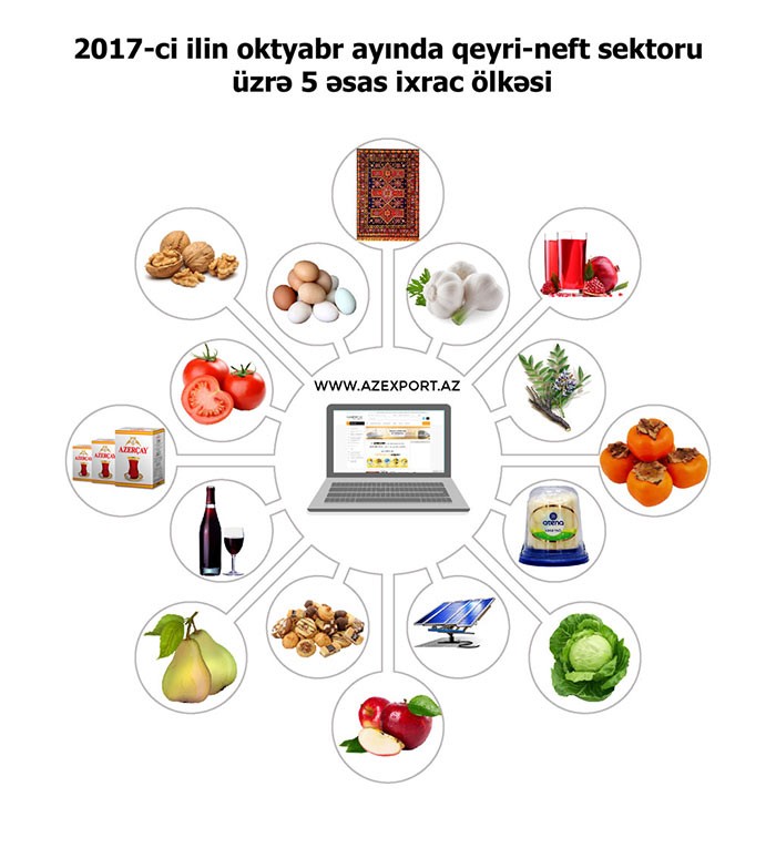 2017-ci ilin 10 ayı ərzində ixrac olunan qeyri-neft sektoru məhsulları arasında birinci yeri pomidor (tomat) 131.5 milyon ABŞ dolları ilə tutub. İkinci yerdə qızıl (98.5 milyon ABŞ dolları) və üçüncü yerdə qabığı təmizlənmiş meşə fındığı (88.6 milyon ABŞ dolları) dayanır.