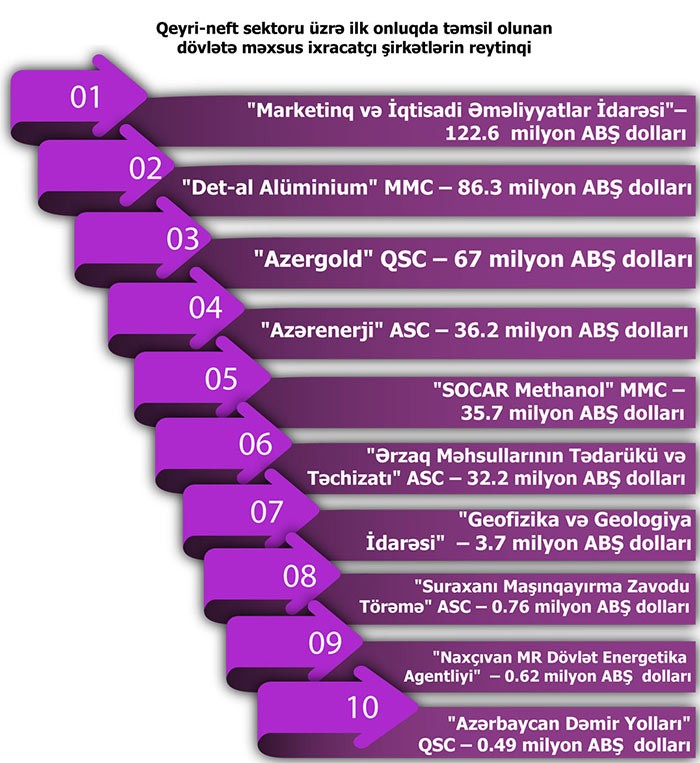 Qeyri-neft sektoru üzrə ixrac əməliyyatlarında iştirak edən dövlətə məxsus şirkətlərin siyahısında isə ilk onluqda ARDNŞ-in “Marketinq və İqtisadi Əməliyyatlar İdarəsi”, “Det-al Alüminium” MMC, “Azergold” QSC, “Azərenerji” ASC, “SOCAR Methanol” MMC, “Ərzaq Məhsullarının Tədarükü və Təchizatı” ASC, ARDNŞ-in “Geofizika və Geologiya İdarəsi”, “Suraxanı Maşınqayırma Zavodu Törəmə” ASC, “Naxçıvan MR Dövlət Energetika Agentliyi” və “Azərbaycan Dəmir Yolları” QSC təmsil olunurlar.