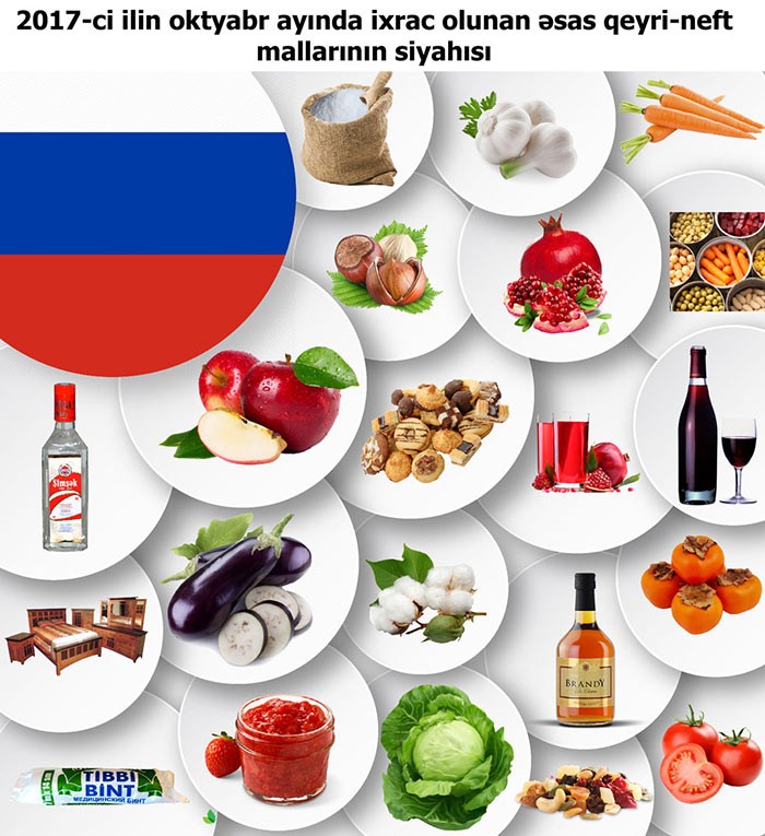 Daxil olan sifarişləri məhsullar üzrə təhlil etdikdə məlum olub ki, oktyabr ayında ən çox ixrac sifarişi nar şirəsi, konservləşdirilmiş tərəvəzlər, kosmetik vasitələr, şərab, alma, armud, nar, xurma, pomidor, sarımsaq, kələm, çay, qənnadı məhsulları, günəş paneli, tütün, biyan kökü, meyvə qurusu, ipək xalça, cemlər, boya, tibbi spirt, şəkər tozu və s. mallar daxil olub. Oktyabr ayında Rusiyadan daxil olan sifarişlərdə artım müşahidə olunub.