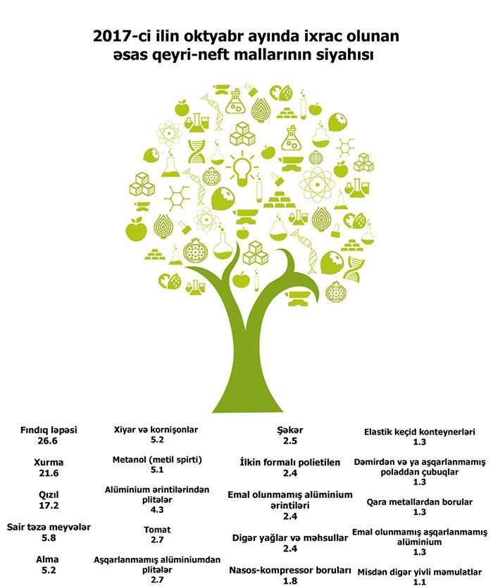 Cari ilin oktyabr ayında isə qeyri-neft sektoru üzrə 475 subyekt tərəfindən 149.6 milyon ABŞ dolları dəyərində ixrac əməliyyatları həyata keçirilib. Oktyabr ayı üzrə ixrac olunan əsas mallar qabığı təmizlənmiş meşə fındığı, xurma, qızıl (sikkə kəsilməsində istifadə olunmayan, digər emal olunmamış formalarda), alma, xiyar və kornişonlar, metanol (metil spirti), alüminium və s. olub. Oktyabr ayında qabığı təmizlənmiş meşə fındığının ixracının dəyəri 26.6 milyon ABŞ dolları, xurmanın ixracının dəyəri 21.6 milyon ABŞ dolları, qızılınixracının dəyəri 17.2 milyon ABŞ dolları təşkil edib.