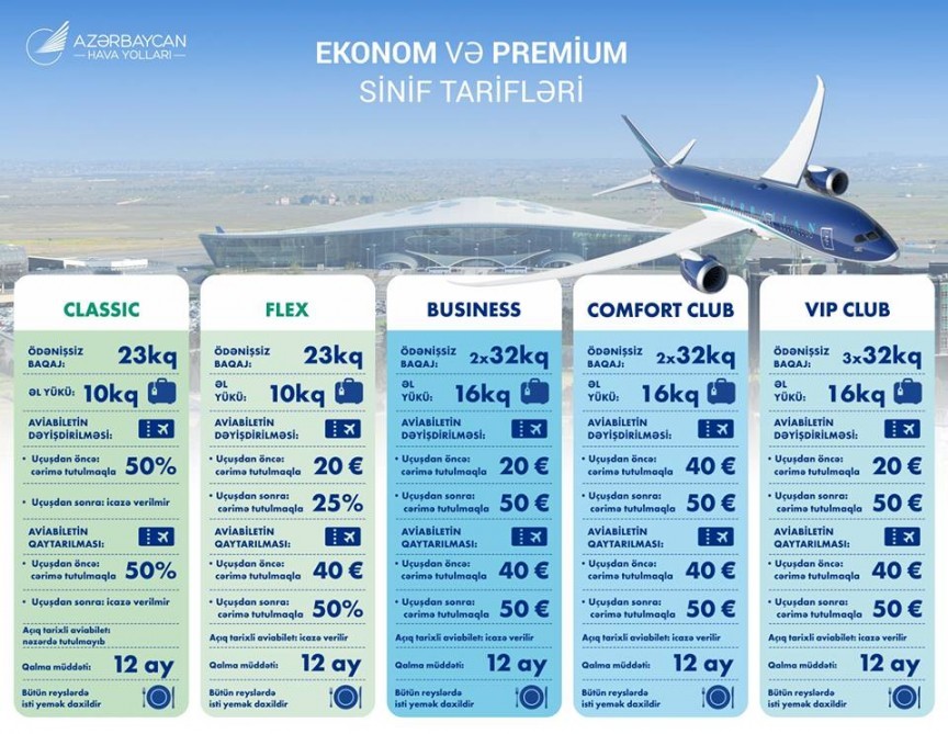AZAL rəsmi saytından və rəsmi agentliklərdən aviabiletin alınması zamanı tətbiq olunan yeni tariflər barədə infoqrafikada məlumat yayıb.