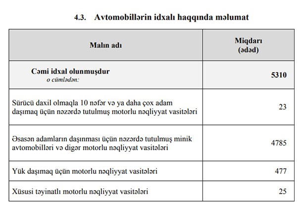 İlk 4 ayda ölkəyə gətirilən avtomobillərin 23 ədədi sürücü daxil olmaqla 10 nəfər və ya daha çox adam daşımaq üçün nəzərdə tutulmuş motorlu nəqliyyat vasitələri, 4 785 ədədi əsasən adamların daşınması üçün nəzərdə tutulmuş minik avtomobilləri və digər motorlu nəqliyyat vasitələri, 477 ədədi yük daşımaq üçün motorlu nəqliyyat vasitələri, 25 ədədi isə xüsusi təyinatlı motorlu nəqliyyat vasitələridir.