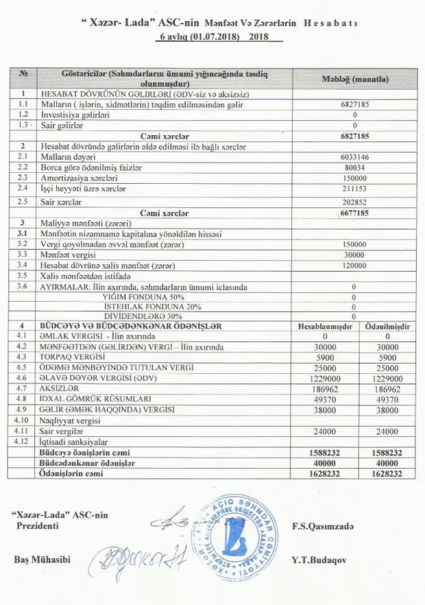 Rusiyanın "AvtoVAZ" Konserninin Azərbaycanda rəsmi idxalçısı “Xəzər Lada” ASC 2018-ci ilin birinci yarısını 120 min manat xalis mənfəətlə başa vurub.