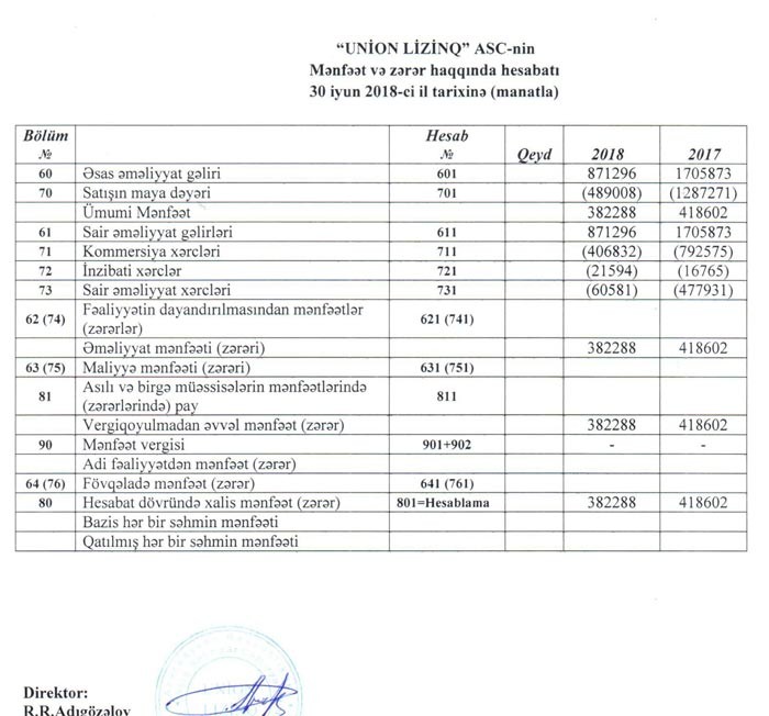 “Union Lizinq” ASC 2018-ci ilin birinci yarısını 382 min 288 manat xalis mənfəətlə başa vurub. Bu, 2017-ci ilin xalis mənfəətilə müqayisədə təxminən 9% azdır. ASC 2017-ci il 418 min 602 manat xalis mənfəətlə bağlamışdı.